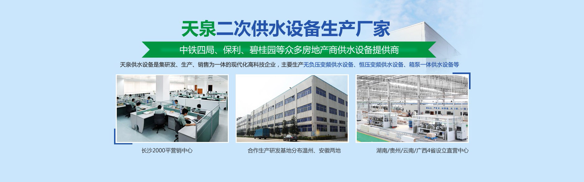 長沙天泉供水設(shè)備有限公司位于長沙雨花經(jīng)濟(jì)開發(fā)區(qū)。公司是集研發(fā)、生產(chǎn)、銷售為一體的現(xiàn)代化科技型企業(yè)公司生產(chǎn)銷售的產(chǎn)品有無負(fù)壓變頻供水設(shè)備、自來水加壓泵站、變頻調(diào)速恒壓供水設(shè)備、智慧標(biāo)準(zhǔn)泵房、智慧水務(wù)、一體化預(yù)制泵站、循環(huán)水系統(tǒng)工程等二十幾大類別。